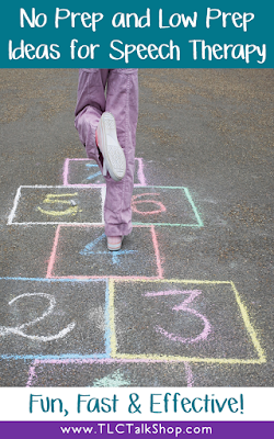 - HOPSCOTCH ARTICULATION/LANGUAGE. You could get fancy and get a hopscotch rug but why spend that money? I simply put pieces of colored paper on the ground in a hopscotch pattern and place the articulation or language cards down on the colored paper. Students take turns tossing a penny to the square and then hop their way to pick it up and finish the pattern to the end. No matter if they make it all the way to the end or not without falling, they practice their word or skill. However, they can only keep the card if they made it through without falling. Be sure to CLEAR THE AREA of any thing that the students could fall into and hurt themselves (chairs, tables, desk, keep away from filing cabinets and bookshelves). If you do not have enough room to do this in your speech room, I have taken speech outside when it wasn’t too cold or windy, and have used it in the gym/cafeteria.