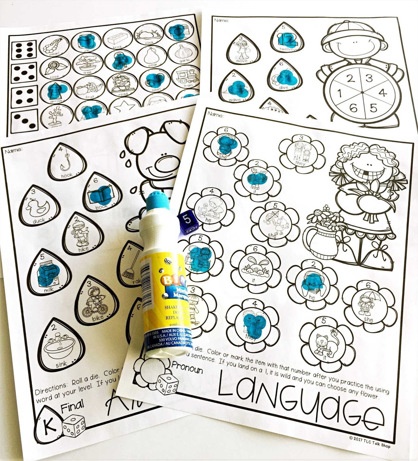 PLAY DOUGH and DAUBER pages for ARTICULATION, APRAXIA, CONVERSATIONAL EXCHANGE, FLUENCY, LANGUAGE, and PHONOLOGY– My students love when I pull out my Mash & Mark sets. I made a whole set of resources to address a variety of needs with colorful playdough mats and low ink black and white dauber pages. Just pull out the play dough, crayons, or daubers and enjoy! Planning speech has never been so simple for me! I have found that having these resources always available it makes quick changes possible (a new student transfers to my caseload, little are too wiggly and need a back up plan, need to change up activity due to lack of progress with planned speech activity, etc..).