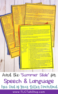 I want my students to return from the summer refreshed with a lot of wonderful family experiences that they can communicate about and share with me. I send the same three-page letter home with all of my students. The handout shares the information that I did above but it also goes into detail on different ways to build speech and language skills within these activities.