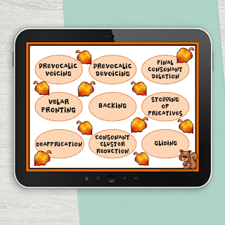 This past year, I created a NO PRINT PHONOLOGY TASKS: AUTUMN resource and my students love it! I love it more since it covers a variety of phonological processing errors using auditory bombardment list, auditory discrimination with minimal pairs, rhyming task, wh-questions, and creating an autumn scene! This resource covers the following phonological processing error patterns: